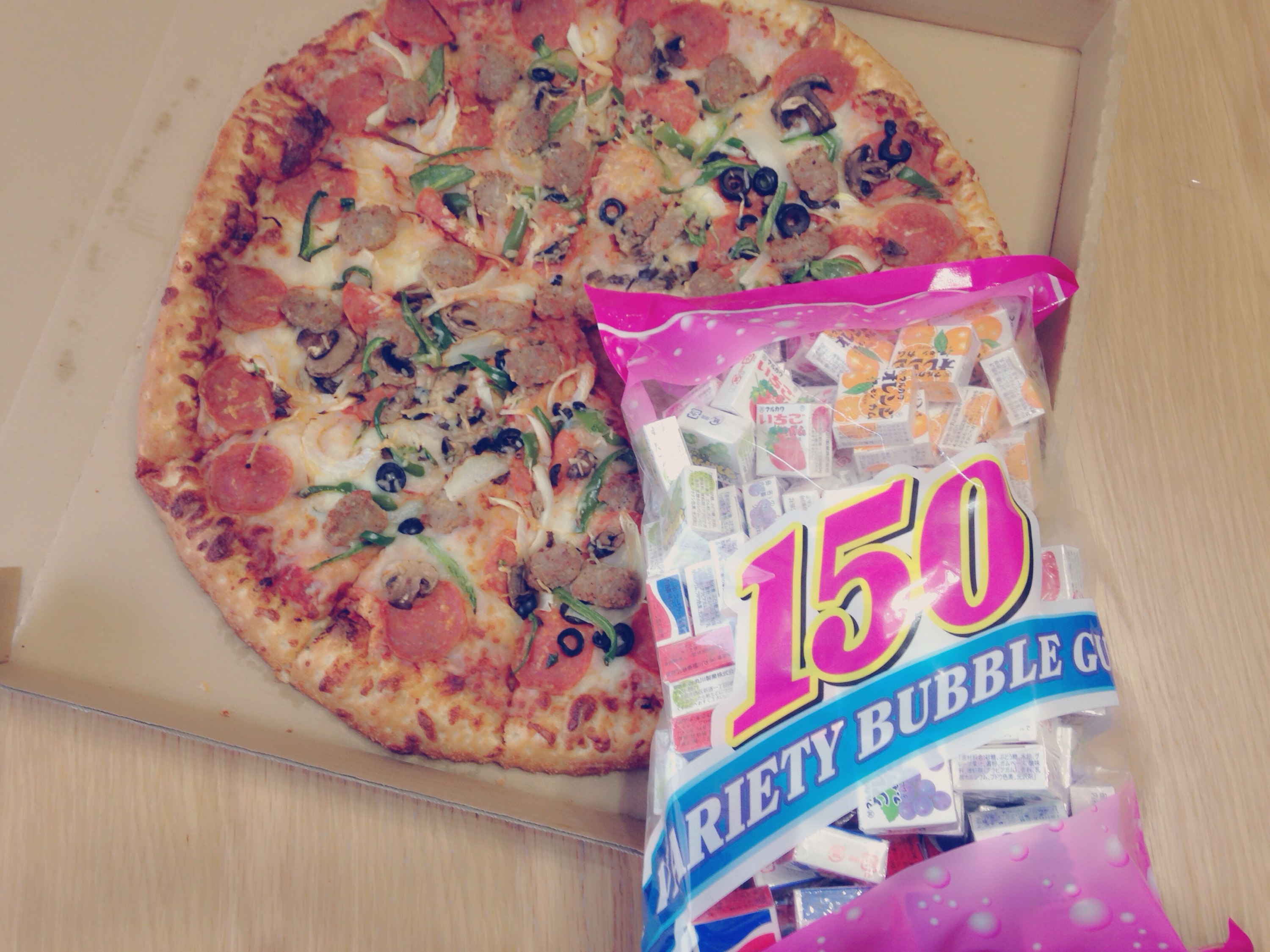 LLLサイズくらいのピザ&150個入りのフーセンガムでした(笑)