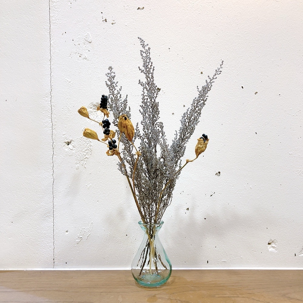 こちらは前回ご紹介したワイルドフラワーの仲間がやはりきれいにドライになったので以前ドライになっていたヒオウギの実と合わせてにシックな感じにしてみました!!