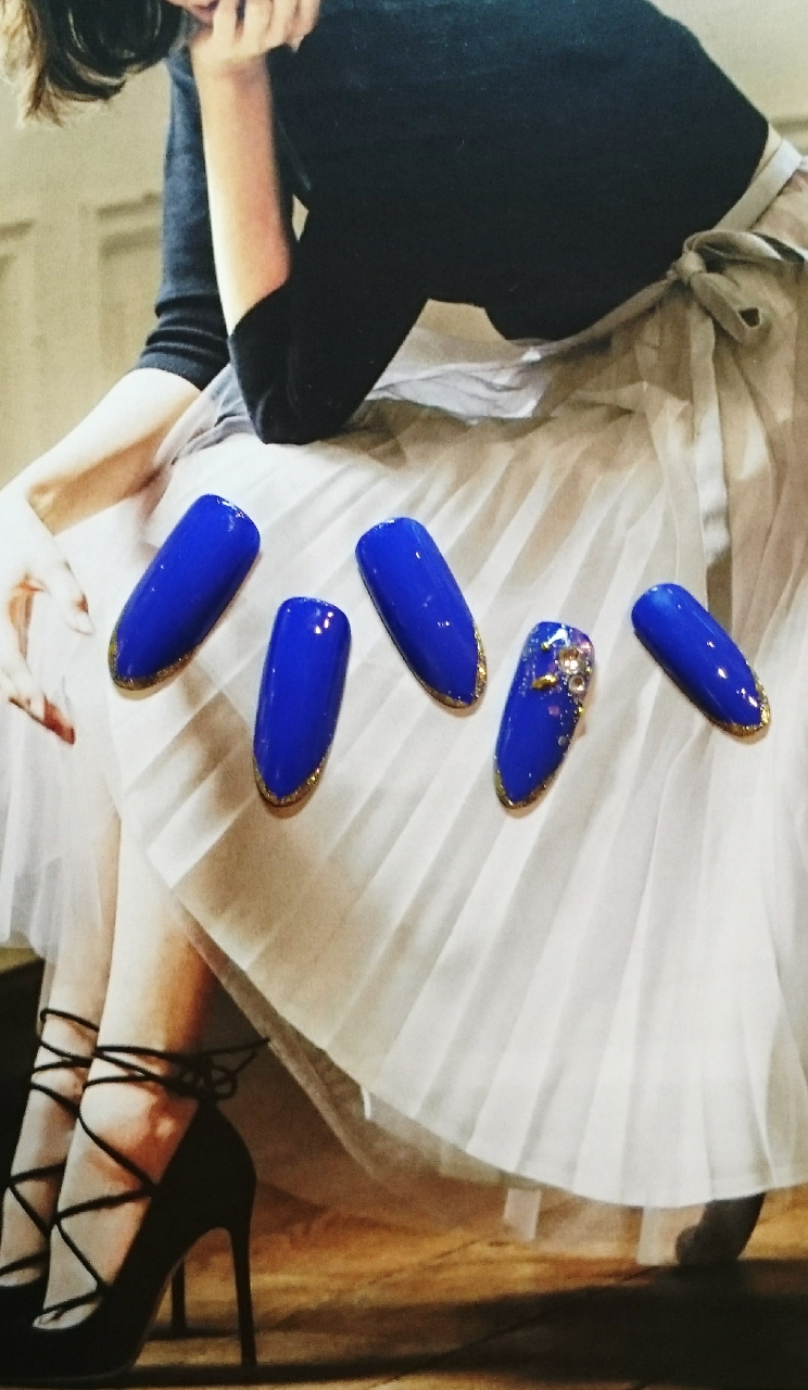 秋色でサンプル~ いいですよね~藍色✨ 爪先にゴールドのラメ✨ ベージュでも落ち着いたオフィスネイルにぴったりですよ‼ リピーター様も 5500円(税別)と 大変お得になっておりますので 是非一度お試しください💕