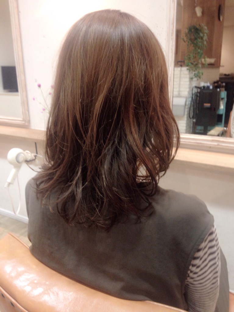 いつもは明るくなりやすい髪質なので8〜9レベルで染めることが多いのですが、今回はある程度長さも切ったので派手になりすぎないであろうと言うことで10〜11レベルくらいになるように染めてもらいました(^-^)