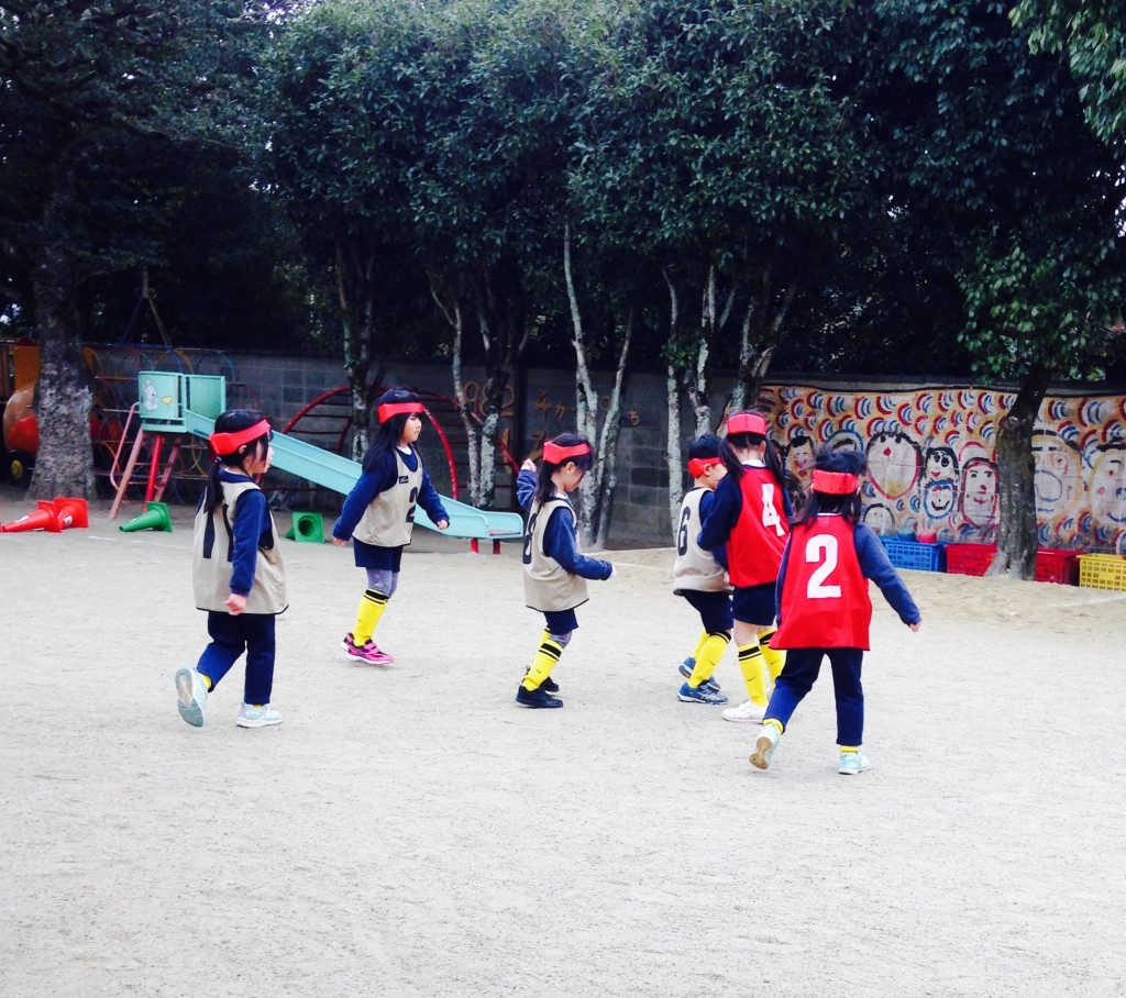 毎回見に行きたいとは思っているもののなかなか行けず、行けたとしてもチラッとだけだったのですが、今回初めて最初から最後まで見ることがでしました(≧▽≦)試合もしました。まずはチームで集まりキーパー決め!