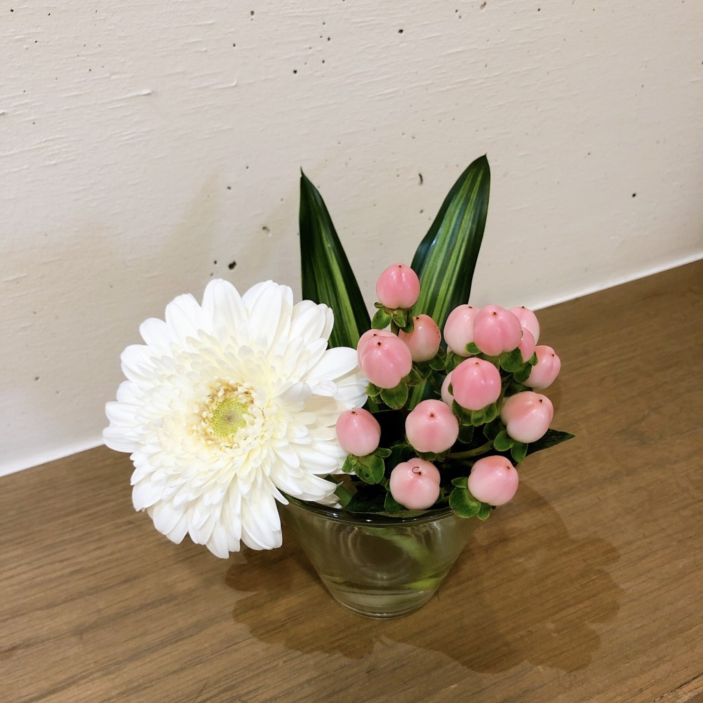 真っ白な八重のガーベラとピンクのヒペリカム!